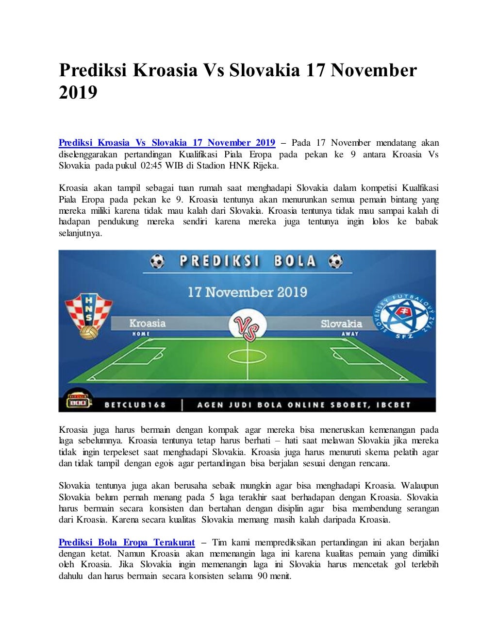 Prediksi Kroasia Vs Slovakia 17 November 2019